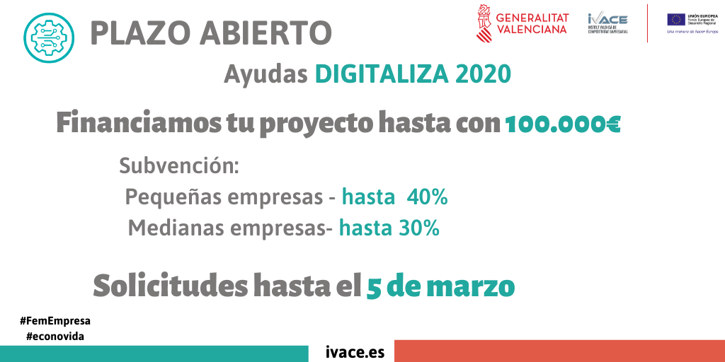 El conseller de Economía Sostenible, Sectores Productivos, Comercio y Trabajo, Rafa Climent ha indicado que “en 2020 la unidad de innovación del Instituto Valenciano de Competitividad Empresarial (IVACE), financiará hasta con 100.000 euros, los proyectos de digitalización presentados por las pymes.” (23-1-2020)