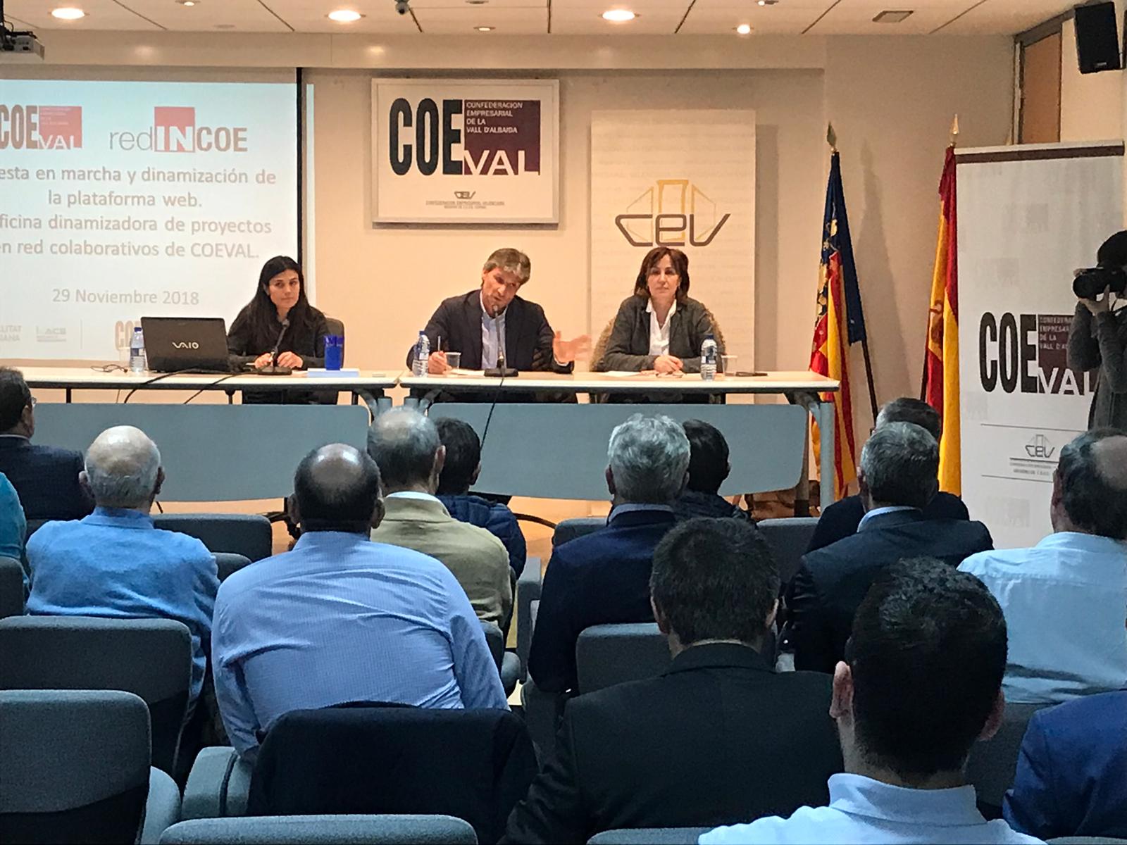 Plataforma coeval 1La directora general del Instituto Valenciano de Competitividad Empresarial (Ivace), Júlia Company, ha asistido a la presentación de REDIncoe; la plataforma on line creada por COEVAL con la financiación del Ivace, para informar,  asesorar  e impulsar proyectos en colaboración entre las empresas de la comarca (29-11-2018)