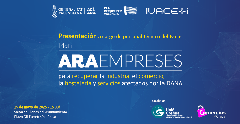 El jueves 29 mayo 2025, a las 15:00h se celebra la jornada de presentación del Plan Ara Empreses, a cargo de personal técnico del Ivace, con la colaboración de Unió Gremial y la Asociación de Comercios de Chiva. El acto, tendrá lugar en el salón de plenos del Ayuntamiento.