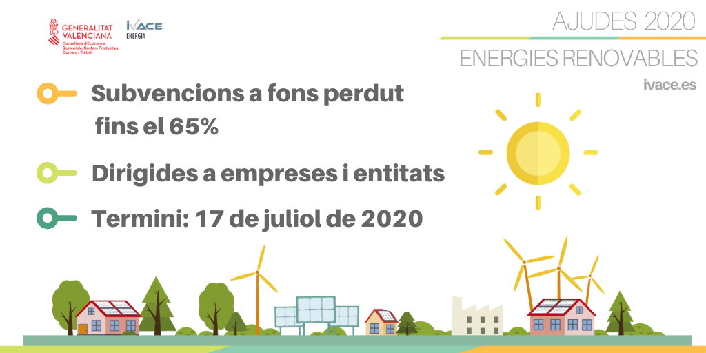 L'Institut Valencià de Competitivitat Empresarial (IVACE), dependent de la conselleria d'Economia Sostenible, Sectors Productius, Comerç i Treball, destinarà enguany un total de 1,5 milions d'euros per a impulsar les energies renovables en les empreses i entitats del nostre territori (10-6-2020)